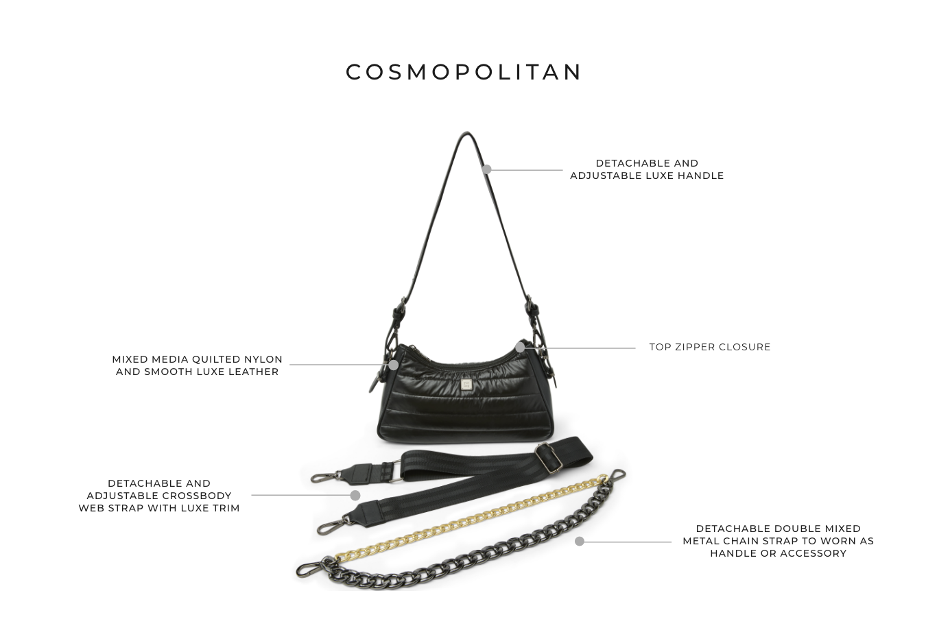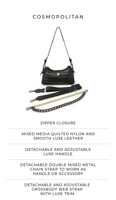 Named after our favorite cocktail and vibe…the Cosmopolitan is sophisticated, worldly, full of style and comfortable anywhere! She moves from one lifestyle to another with ease…from an uptown handbag to an edgy evening bag…from daytime work or play to nighttime adventures, the Cosmopolitan is your go to companion. The silhouette is a classic handbag, modernized with mixed media quilted nylon and smooth, luxe leather detailing. Strap options and detailing allow the Cosmopolitan to be worn your way from crossbody to a versatile handbag. What makes the Cosmopolitan the next level it bag? The mixed metal double chain strap, of course!