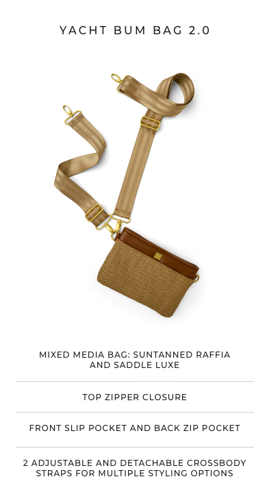 Welcome the newest addition to The Think Royln Bum Bag Family...The Yacht Bum Bag 2.0 has arrived! This luxury 2.0 version is a mixed media edit bringing together luxe saddle detailing and resort chic raffia...perfect to go from the city streets to the high seas. Yacht rock vibes anyone?